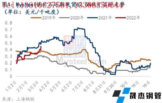 进入2022年,铁矿石远期现货62.5%块矿溢价(以下简称远期块矿溢价)大幅反弹,由1月初的0.1945美元/干吨度涨至目前的0.4465美元/干吨度,累计上涨0.252美元/干吨度,涨幅130%(图一)。其中,一季度涨幅接近去年同期水平但远高于2020年同期。本文主要从基本面、焦炭、替代品三个因素来分析此轮块矿溢价大幅上升的原因,同时对其短期走势做出预判。