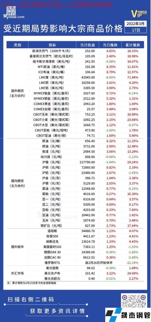 近期,受国际局势影响,全球金融及大宗商品市场出现较大波动。3月17日,国际油价大幅反弹。汇总情况如下:
