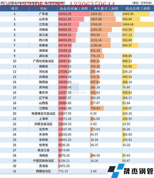 从各省市房地产开发规模与开、竣工面积增长情况来看,31省市1-2月的商品房屋施工面积共784459.24万平方米,其中25省市施工面积在10000万平方米以上。排名前三的分别是广东、山东和江苏,施工面积均在50000万平方米以上。排在末三位的为宁夏、青海、西藏,施工面积均低于5000万平方米,其中西藏施工面积仅有771.15万平方米。