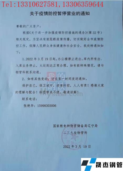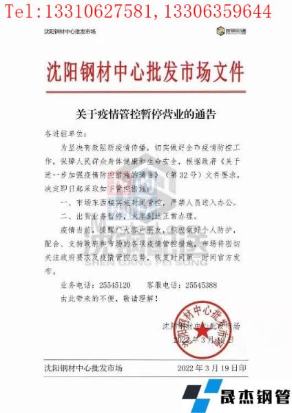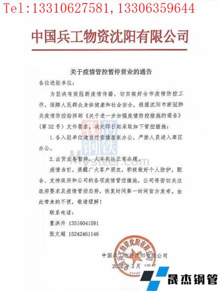 目前沈阳向日葵色视频在线观看无缝钢管中心批发市场已发布通告,19日起北一西路东西楼试试封闭管控、严禁人员进入办公,出库业务暂停、火车到达正常办理;中国兵工物资125库通告19日起严禁人员进入库区办公,出库业务暂停、火车到达正常办理;国家粮食和物资储备局辽宁局二三九处通告19日起办公楼严禁进出,库内所有出入库业务暂停、火运到达正常办理。市内其他主要向日葵色视频在线观看无缝钢管市场反馈暂时正常办公及出库,但从防控指挥部通告内容来看、也有暂停营业的倾向。(通告见文末图片)