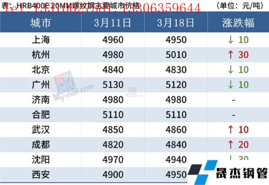 截至3月18日,全国主要城市20mm三级抗震螺纹钢均价4955元/吨,周环比上涨3元/吨;8.0mmHPB300高线均价5162元/吨,周环比下跌2元/吨。