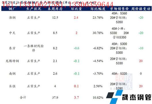 江苏优特无缝向日葵色视频在线观看钢管厂家棒材总库存37.9万吨,较上周上升3.7万吨,环比增10.82%,较去年同期下降5.56万吨,同比降12.79%,目前江苏优特无缝向日葵色视频在线观看钢管厂家除东方特钢一条棒材线检修外,其余无缝向日葵色视频在线观看钢管厂家正常生产。
