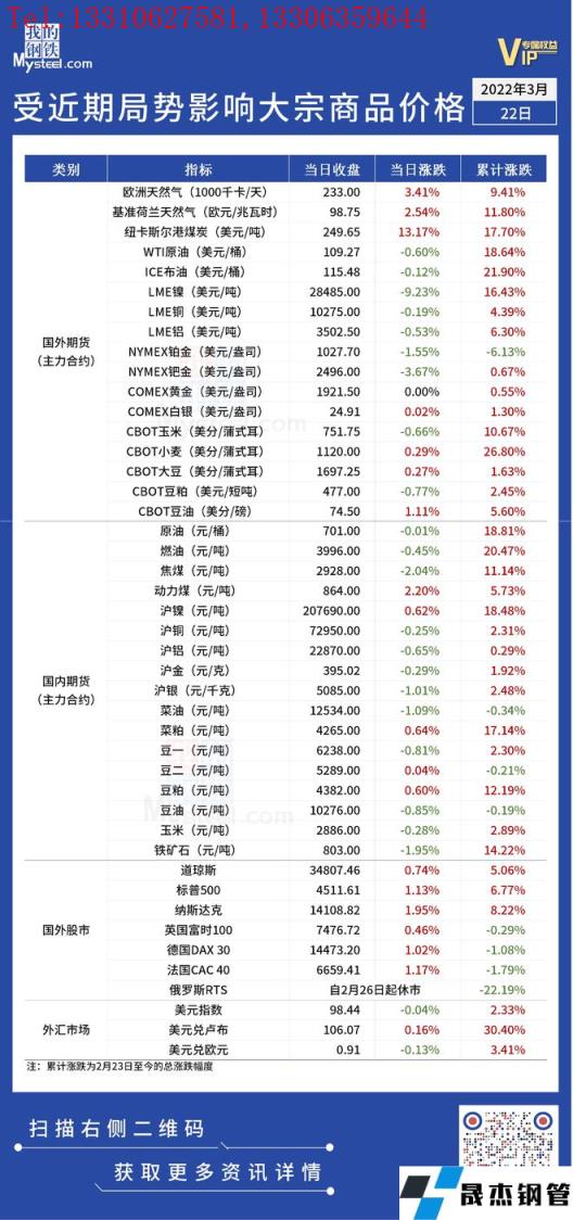 近期,受国际局势影响,全球金融及大宗商品市场出现较大波动。3月22日,国际油价、金属普跌。汇总情况如下: