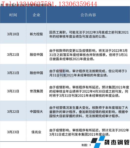 与往年相比,今年房企披露业绩呈扎堆发布的特点,多集中在3月29日-31日。除此之外,截至3月24日,据不完全统计,已有6家重点房企发布公告称将延迟刊发2021年度业绩报告,公告显示延迟原因多为疫情影响,具体情况如下: