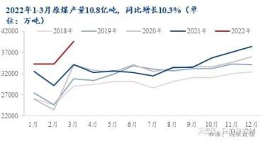 2022年1-3月全国原煤产量累计生产10.8亿吨,同比增长10.3%,其中3月份原煤产量3.96亿吨,同比增长14.8%。国家能源局3月发布《2022年能源工作指导意见》,提出将着力增强国内能源生产保障能力,切实把能源饭碗牢牢地端在自己手里。