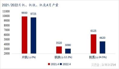 2022年4月片钒产量相比2021年同比下降2%;钒铁同比下降12.2%;钒氮合金同比下降24.5%。两年相比片钒产量变动不大,钒氮合金及钒铁产量下降明显,其原因在于4月合金企业受到上下游双向挤压,利润单薄甚至亏损,从而影响了4月开工率,进入5月,合金企业依旧面临倒挂问题,不排除开工率会进一步收缩。