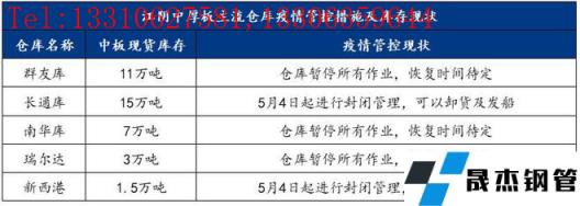 5月4日,江阴疫情爆发,本地中厚板主流仓库群友库、南华库、瑞尔达库全部暂停所有作业,卸货、提货均停止,涉及中板库存量21万吨。长通库、新西港施行封闭管理,码头可以卸货及发船,汽运停止,涉及中板库存量16.5万吨。此轮疫情管控,使得江阴本地40万吨现货中板库存将近一半成为死库存,另外一半流通性也大大减弱,具体明细如下: