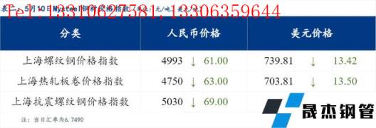 5月10日普钢绝对价格指数变化:综合指数5177.26,下跌43.86;螺纹钢指数4975.63,下跌49.88;线材指数5355.29,下跌47.08;热轧板卷指数4916.54,下跌59.11;冷轧板卷指数5462.65,下跌35.59;中厚板指数5174.25,下跌24.65。