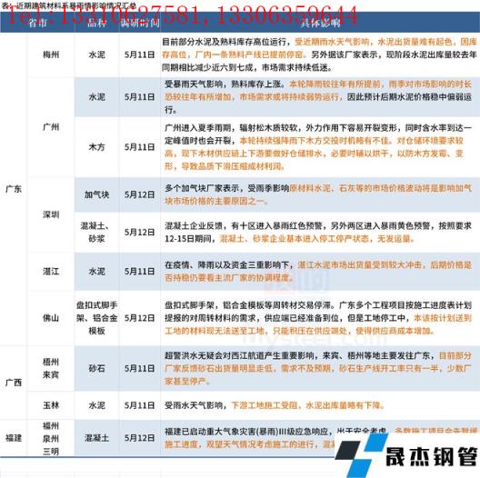 截至5月12日,据百年建筑网调研,3省建材市场和建筑工地进度受到明显影响。本次降雨是今年以来广东遭遇强度最强、范围最广、持续时间最长的强降水过程,城乡积涝和地质灾害风险极高,严重影响水泥企业出库。目前降雨情况来看,多数施工项目会先暂缓施工进度,观望天气情况再考虑施工的进行。具体情况如下: