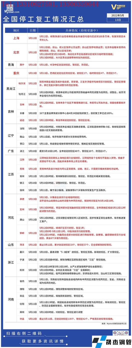 截至5月13日,据不完全统计,共有13个省份发布了停工复工最新信息。江阴、承德继续施行全域封控。北京多区实施管控措施。菏泽全部解除封控管控。具体情况如下: