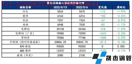 截止2022年5月13日,各原材料当日即时价格以及价格周环比情况如下: