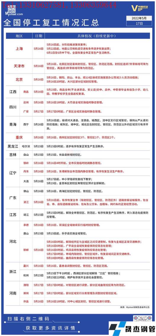 截至5月17日,据不完全统计,共有15个省份发布了停工复工最新信息。5月16日起,上海分阶段推进复商复市。天津多地划分为封控管控区。湛江有序恢复道路旅客运输服务。四川广安市广安区、达州市大竹县全域实施临时静态管理。具体情况如下: