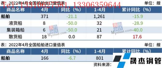4月船舶进口166艘,同比减少6.7%;1-4月累计进口801艘,同比增长6.2%。