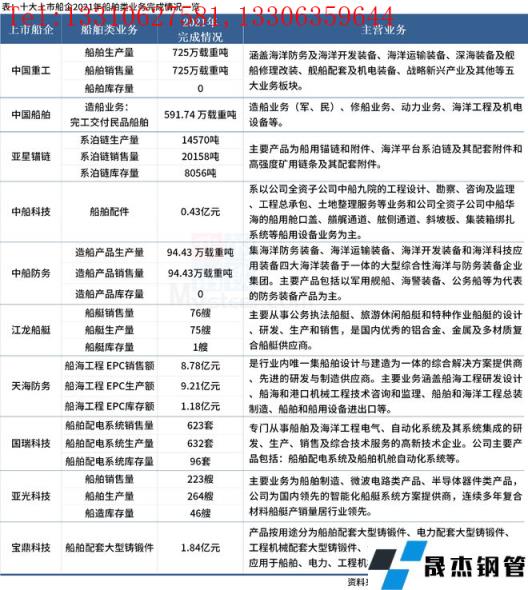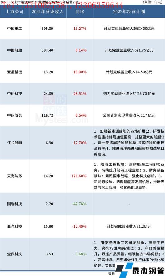 10大上市船企2022年经营计划以及2021年船舶类业务完成具体情况如下:
