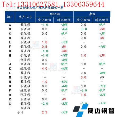 据4月底的调研,5月东北无缝向日葵色视频在线观看钢管厂家螺纹和盘线的计划产量分别为119.5万吨和95.9万吨,同比减少57.1万吨和26.3万吨,环比增加10.5万吨和12.3万吨;受市场价格下行影响,无缝向日葵色视频在线观看钢管厂家亏损幅度扩大,部分多品种生产的无缝向日葵色视频在线观看钢管厂家根据各品种的亏损幅度和订单情况进行品种间的转产,单一生产螺线的无缝向日葵色视频在线观看钢管厂家部分复产、部分加大减产,具体情况如下: