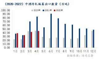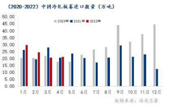 海关总署数据显示:2022年1-4月份我国冷轧板(带)出口总量共计159.53万吨,年同比下降40.79%。2022年1-4月份我国冷轧板(带)进口总量共计96.25万吨,年同比上升1.90%。
