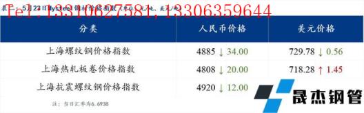 5月23日普钢绝对价格指数变化:综合指数5094.32,下跌8.39;螺纹钢指数4842.56,下跌9.26;线材指数5239.01,下跌5.27;热轧板卷指数4888.7,下跌13.55;冷轧板卷指数5396.14,下跌4.01;中厚板指数5104.15,下跌8.67。