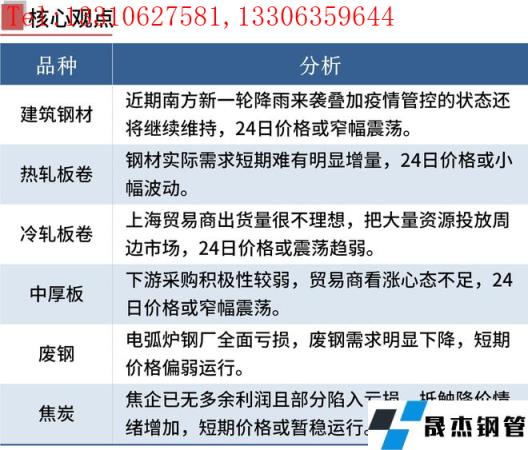 建筑向日葵色视频在线观看无缝钢管:5月23日,全国31个主要城市20mm三级抗震螺纹钢均价4839元/吨,较上个交易日下跌10元/吨。短期来看,目前市场供应端同比持续低位,同时近期南方新一轮降雨来袭叠加疫情管控的状态还将继续维持,消费难有好转预期。目前市场仍然处于供需双弱的格局。短期市场关注点仍在于消费能否有效恢复以及雨季对于消费的影响,因此预计24日国内建筑向日葵色视频在线观看无缝钢管现货价格窄幅震荡为主。