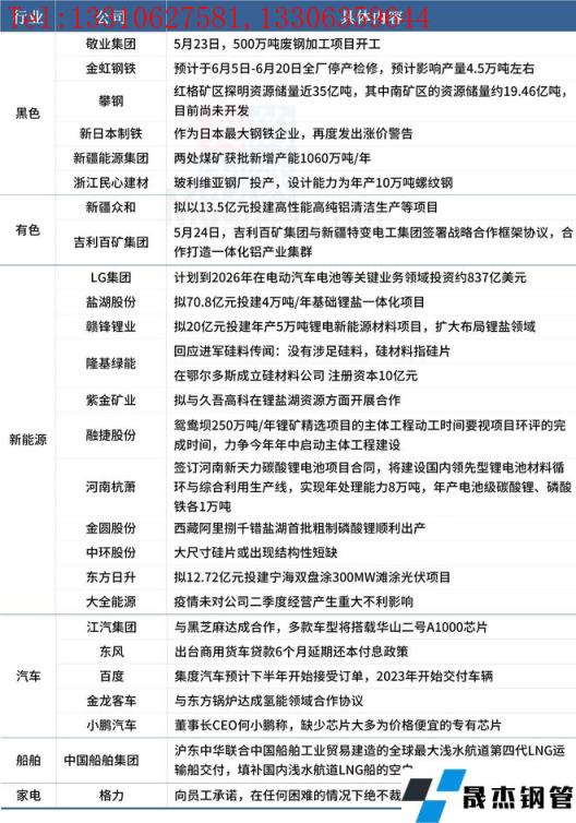 金虹钢铁预计于6月5日-6月20日全厂停产检修,预计影响产量4.5万吨左右;新疆众和拟以13.5亿元投建高性能高纯铝清洁生产等项目;LG集团计划到2026年在电动汽车电池等关键业务领域投资约837亿美元;格力向员工承诺,在任何困难的情况下绝不裁员。具体情况如下: