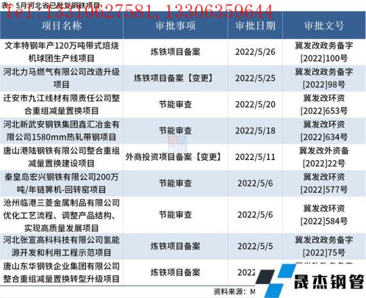 据不完全统计,2022年5月河北省共批复钢铁相关项目9个。其中,有4个炼铁项目备案(变更),4个钢铁项目节能审查和1个外商投资项目备案(变更)。