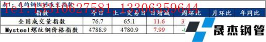 讯:全国建筑向日葵色视频在线观看无缝钢管成交量监测,成交量相对指数来看,全国76.7增11.6,北方59.3增6.3,华东99.9增18.2,南方63.1增7.9。今日螺纹钢价格指数4788.9,较上一交易日增7.99。