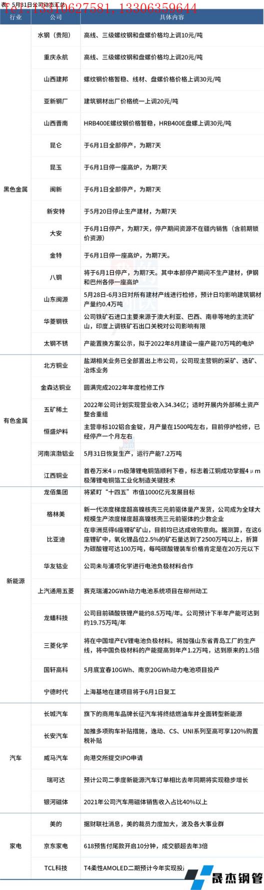 宁德时代上海基地在建项目将于6月1日复工;五矿稀土2022年公司计划实现营业收入34.34亿;欣旺达拟投入23亿元建设年产3.1亿只高性能圆柱锂离子电池项目;龙佰集团将紧盯“十四五”市值1000亿元发展目标。具体情况如下: