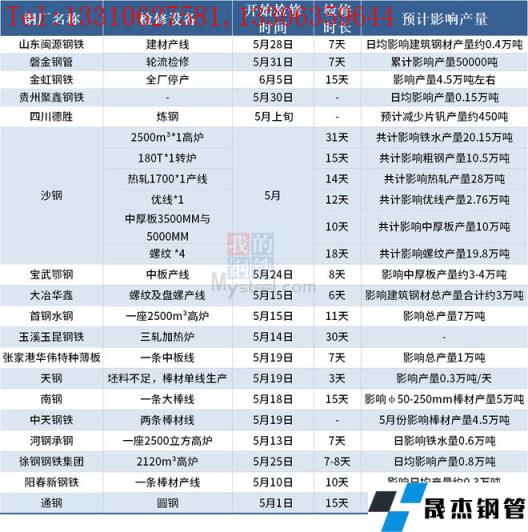 据不完全统计,5月国内18家无缝向日葵色视频在线观看钢管厂家发布检修计划。其中,磐金向日葵色视频在线观看钢管各分厂计划将于5月31日至6月6日进行轮流检修,预计将累计影响产量50000吨。