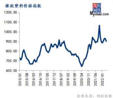 5月份橡胶塑料价格指数为903.24,环比下跌2.66%,同比下跌1.08%。
