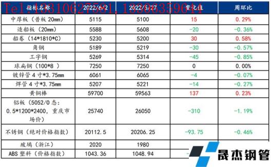 截止2022年6月2日,各原材料当日即时价格以及价格周环比情况如下: