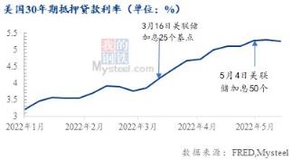 美联储为了抑制国内通胀,分别于3月16日和5月4日加息25和50个基点,预计将在今年累计加息100个基点。而伴随着美联储的不断加息,截至本周,30年期抵押贷款利率飙升至5.1%,处于历史高位。
