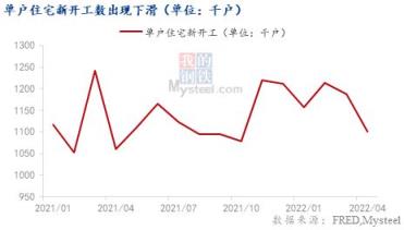 而房贷利率的飞速上涨,使得消费者的购买欲望随之下降。再叠加美国房价居高不下,4月现有房屋销售中位数价格同比去年上涨14.8%至391200美元,创1999年以来新高,导致房屋销售和单户新开工数量均出现下滑。截至4月,单户新开工数量为110万,已连续两月下降,较今年2月下降9%。