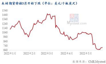 美国木材价格与房市高度相关,随着消费者对房地产的购买意愿下降,木材价格也随之降温。美国木材期货价格从今年三月初的高点开始下落,截至5月底,木材期货价格下降765至700美元/千板英尺。