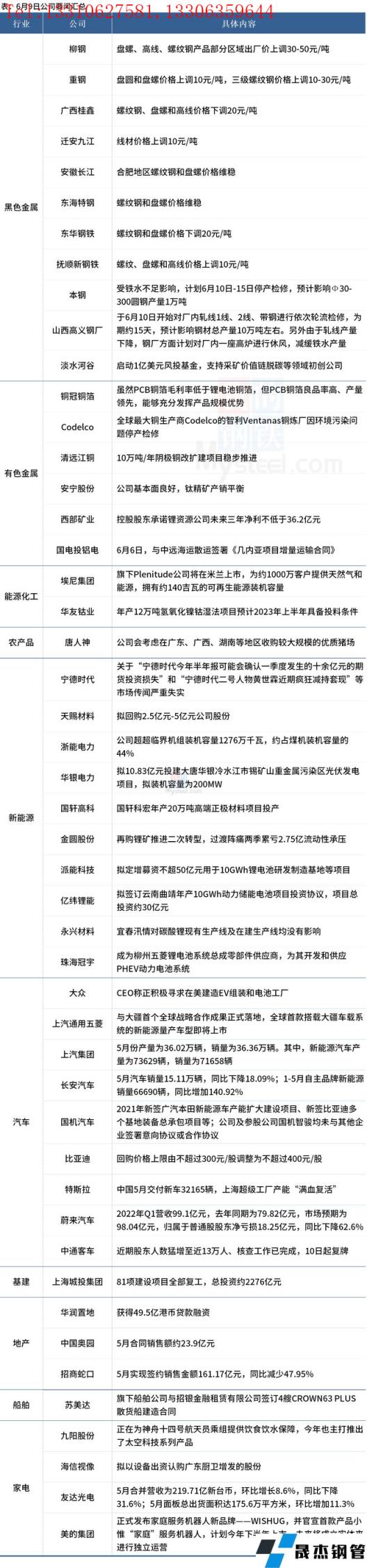 本钢受铁水不足影响,计划6月10日-15日停产检修;清远江铜10万吨/年阴极铜改扩建项目稳步推进;华友钴业年产12万吨氢氧化镍钴湿法项目预计2023年上半年具备投料条件;特斯拉中国5月交付新车32165辆,上海超级工厂产能“满血复活”;蔚来发布Q1财报,营收增长,净利润下滑。