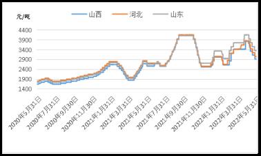据云商平台监测数据显示,截至5月31日,山西临汾地区二级冶金焦含税出厂价在2930元,较月初跌900元;唐山地区二级冶金焦含税出厂价在3050元,较月初跌800元;山东淄博地区二级冶金焦含税出厂价在3360元,较月初跌800元(详见图3)。