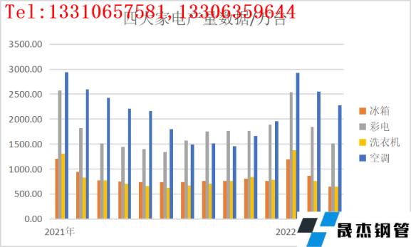2022年4月份,冰箱产量652.4万台,同比下降15.8%;彩电产量1512.7万台,同比增长1.5%;洗衣机产量649.9万台,同比下降15.8%;空调产量2279.2万台,同比下降4.0%;