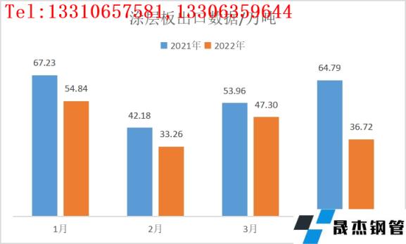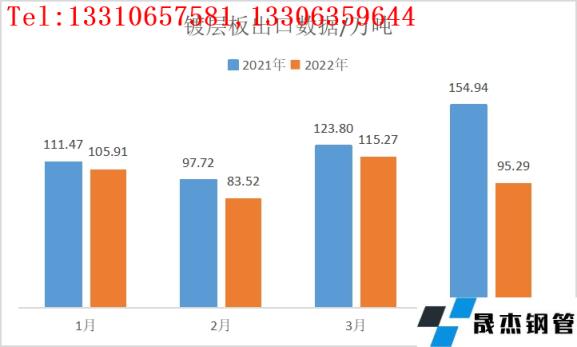 2022年4月我国镀层板(带)出口总量共计95.29万吨,月环比降幅17.33%,年同比降幅38.50%;2022年1-4月份我国镀层板(带)出口总量共计399.99万吨,年同比降幅18.02%。