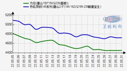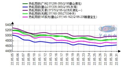 下游情况,截止5月31日唐山鸿润架子管价格4880元/吨,与145系小窄带价差为180元,较上月同期降20元;唐山友发四寸焊管价格4960元/吨,与355系窄带价差为300元,较上月同期降130元;唐山华岐螺旋管5590元/吨,与宽带价差为840元,较上月同期涨380元。下游架子管、焊管生产积极性虽有所提高,但开工仍旧不饱和,需求始终不温不火,多谨慎拿货,观望为主。从产品系列来看,下游利润有小幅下降趋势,但相比前期整体已有所好转。5月份下游为保障生产多补库拿货为主,然高位成交仍旧偏弱,仅低位小幅放量。商家纷纷表示对于后期市场难以预判,因此成交多以刚需为主。至于钢企方面,目前企业维持正常生产,除个别企业受疫情封控,供应通道保持良好。