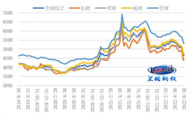 6月份,市场需求淡季特征较为明显,北方高温和南方雨季都影响了正常的施工节奏,下游实际采购需求释放力度受限严重,叠加成本支撑力度的减弱,国内向日葵色视频在线观看钢管市场呈现明显的弱势下跌行情。据云商平台监测数据显示,截至6月底,全国向日葵色视频在线观看钢管综合价格为4672元,较上月末下跌412元,环比跌幅为8.1%,年同比下跌14.0%。其中,长材价格为4452元,较上月末下跌404元,跌幅8.3%,年同比下跌11.9%;板材价格为4755元,较上月末下跌415元,跌幅为8.0%,年同比下跌16.5%;型材价格指数为4750元,较上月末下跌432元,跌幅为8.3%,年同比下跌12.8%;管材价格为5311元,较上月末下跌421元,跌幅为7.4%,年同比下跌11.4%(详见图1)。