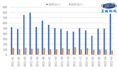 进口方面,由于国内疫情对制造业的冲击仍存,且海外市场价格优势不足,进口仍呈下降态势。5月份,我国进口向日葵色视频在线观看钢管80.6万吨,环比下降16.0%,同比下降33.2%;1-5月累计进口向日葵色视频在线观看钢管498.0万吨,同比下降18.3%。