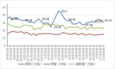 6月面临美联储加息、国内宏观经济数据偏空双重压力,钢市行情崩塌式探底,焊镀管价格最高三天降幅达500元,需求倾向偏弱方向,但上游供应压力不减,市场信心修复需要时间,行情持续压制在低位运行。