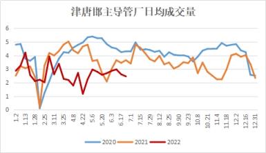 焊镀管厂产能利用率灵活下降。6月在统计管厂总产量145.46万吨,月比增产7.51万吨,月中下旬产能利用率逐步下降至60%左右,周末倒班减产,整体在统计管厂影响产量在14万吨上下,占总产量的22.7%。截至6月23日,天津唐山邯郸主流管厂厂内总体库存68.01万吨,比上月增1.86万吨。进入6月,疫情形势好转,主导管厂协议原料陆续到库,但行情突降,生产利润进入洼地,管厂快速调整产能应对,引导供需向再平衡过渡,整体来看,博弈阶段仍存一定压力(见图4)。