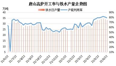 据网调研数据显示:截至6月22日,唐山区域高炉产能利用率78.89%,环比上月下跌0.11个百分点;铁水日均产量较上月减少0.05万吨。