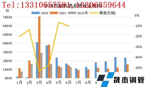 挖掘机销量同比下滑明显。据中国工程机械工业协会行业数据显示,2022年上半年共销售各类挖掘机143094台,同比下降36.1%。其中,国内市场销量91124台,同比下降52.9%;出口销量51970台,同比增长72.2%。分月度数据来看,最高值出现在3月份,挖掘机销量为37085台,同比仍存53.1%跌幅,其中国内销量26556台,同比减少63.6%;出口10529台,同比增长73.5%。最低点出现在1月份,销量为15607台,同比下降20.4%。可以看到的是,2022年6月份挖掘机销量同比降幅大幅收窄,主要得益于封闭管控对物流运输造成的影响减弱,以及稳增长政策落地显效,挖掘机国内销量有所改善。