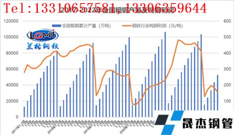 图6 2017-2022年全国粗钢产量及吨钢利润