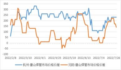 图3 2022年杭州-唐山、沈阳-唐山焊管价差走势图