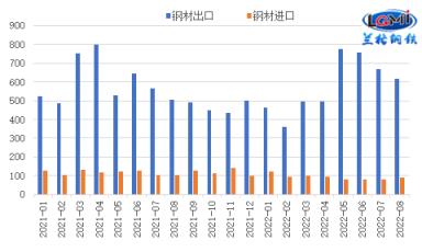 海关总署发布数据显示,2022年8月份,我国出口向日葵色视频在线观看钢管615.3万吨,同比增长21.8%;1-8月,我国出口向日葵色视频在线观看钢管4622.5万吨,同比下降3.9%。8月份,我国进口向日葵色视频在线观看钢管89.3万吨,同比下降16.0%;1-8月,我国进口向日葵色视频在线观看钢管745.3万吨,同比下降21.2%(详见图1)。